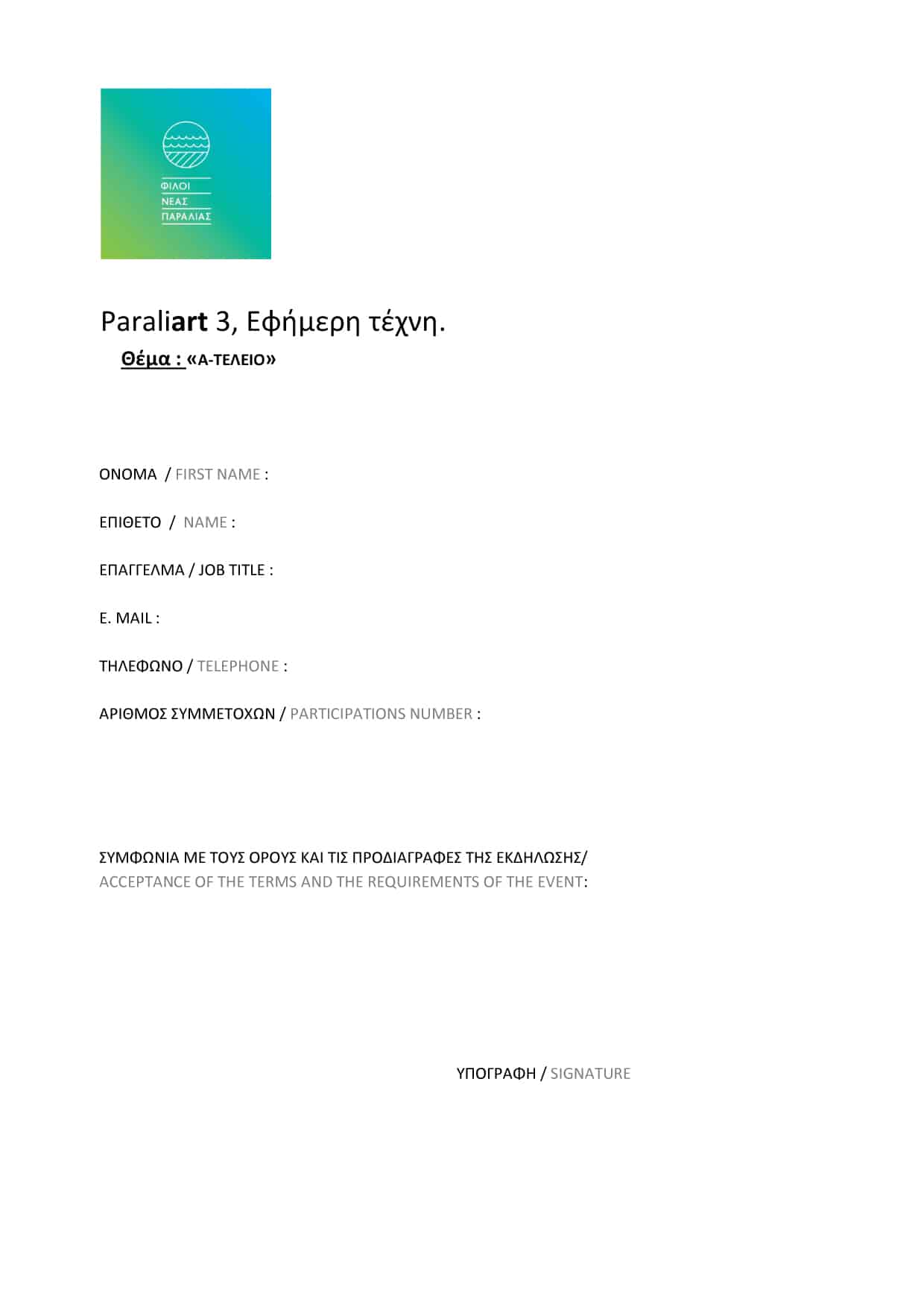 Αυτή είναι η φόρμα συμμετοχής που πρέπει να συμπληρώσουν οι ενδιαφερόμενοι να συμμετέχουν στην εικαστική δράση “Paraliart 3, Εφήμερη τέχνη” με θέμα: Α-ΤΕΛΕΙΟ και να τη στείλουν μέχρι 25 Φεβρουαρίου 2026 στην ηλεκτρονική διεύθυνση: filoi.neas.paralias@gmail.com Πληροφορίες της δράσης θα βρείτε στο διπλανό post